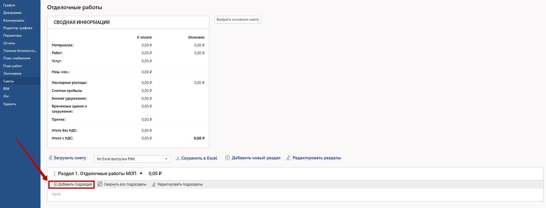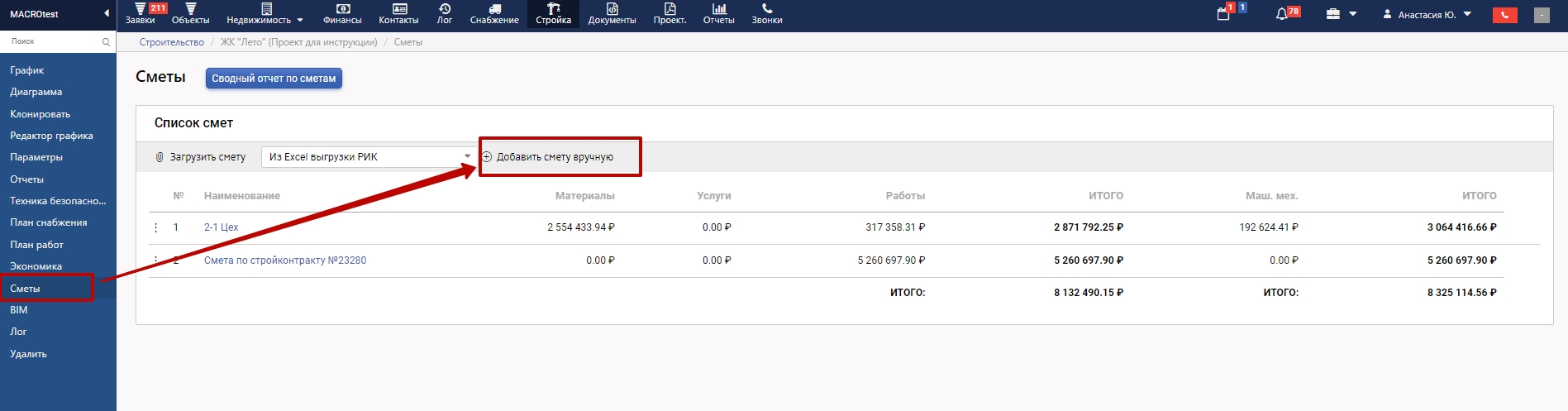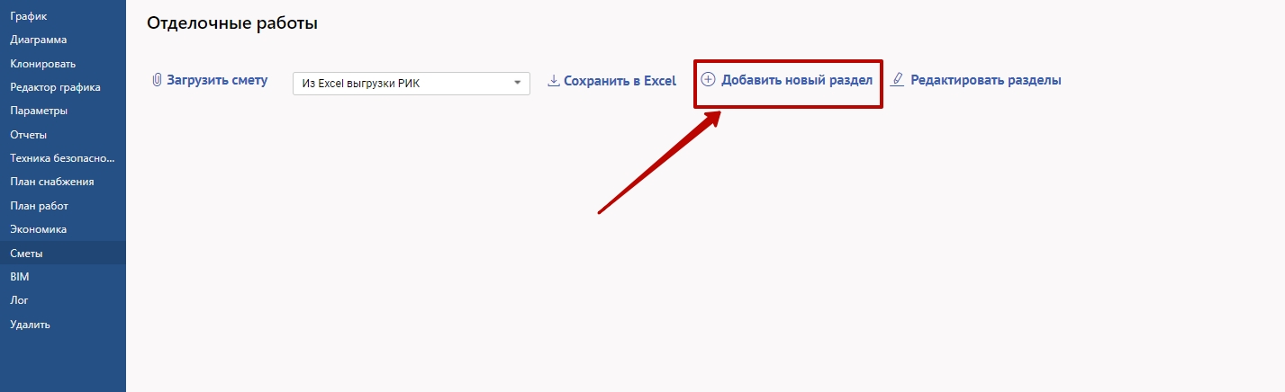 Для этого в выбранном проекте в меню слева выберете "Сметы", далее нажмите "+Добавить смету вручную"