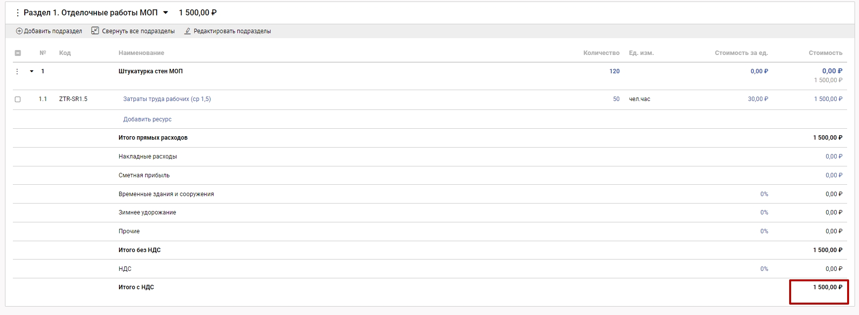 Наполняя смету работами и ресурсами формируется стоимость по каждому разделу и по смете в целом.