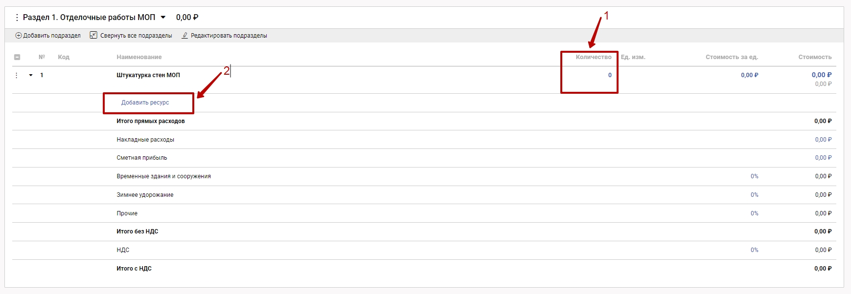 В подраздел (работу) внесите количество (1), а также необходимое количество позиций с ресурсами (трудочасы, машины и механизмы, материалы) (2)