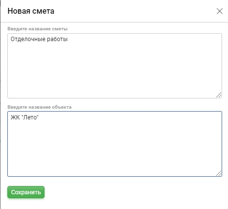 В открывшемся окне введите наименование сметы и при необходимости наименование объекта и нажмите "Сохранить".