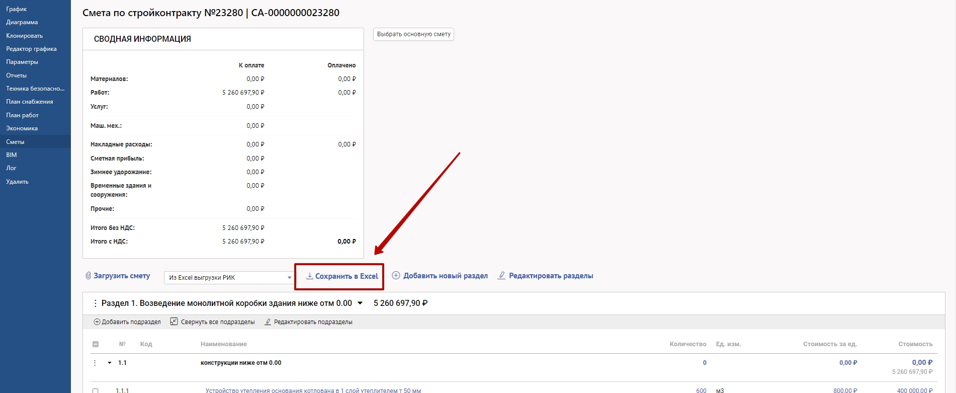 Сформированную смету возможно сохранить в Excel