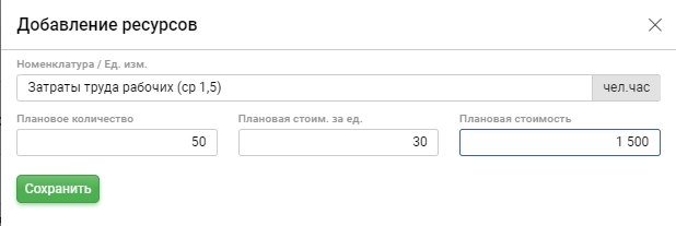 При добавлении ресурса начните вводить наименование и система покажет все возможные совпадения с позициями и номенклатурного справочника, автоматически будет установлена единица измерения, внесите количество и цену за единицу. Сохраните позицию.