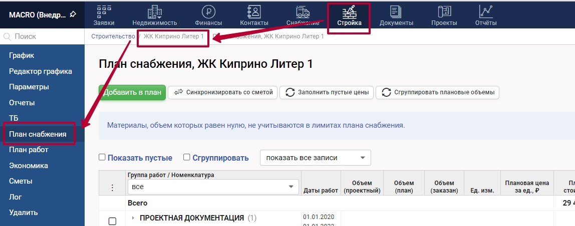1. Откройте План снабжения конкретного проекта через модуль Стройка - Проект - План снабжения