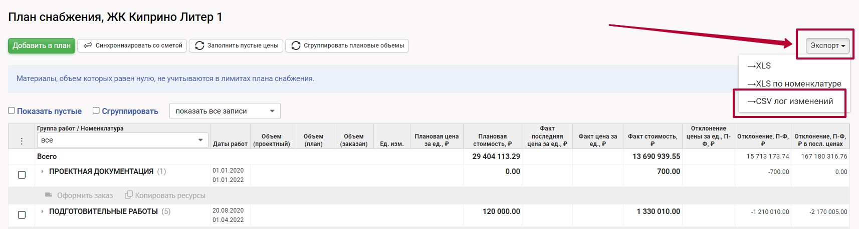 В системе записываются все изменения, производимые с ценой, объемом, а также добавлением/удалением позиций в Плане снабжения.