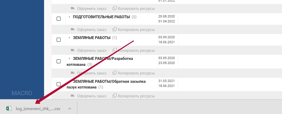 2. Нажмите кнопку "Экспорт" - выберите "CSV лог изменений"