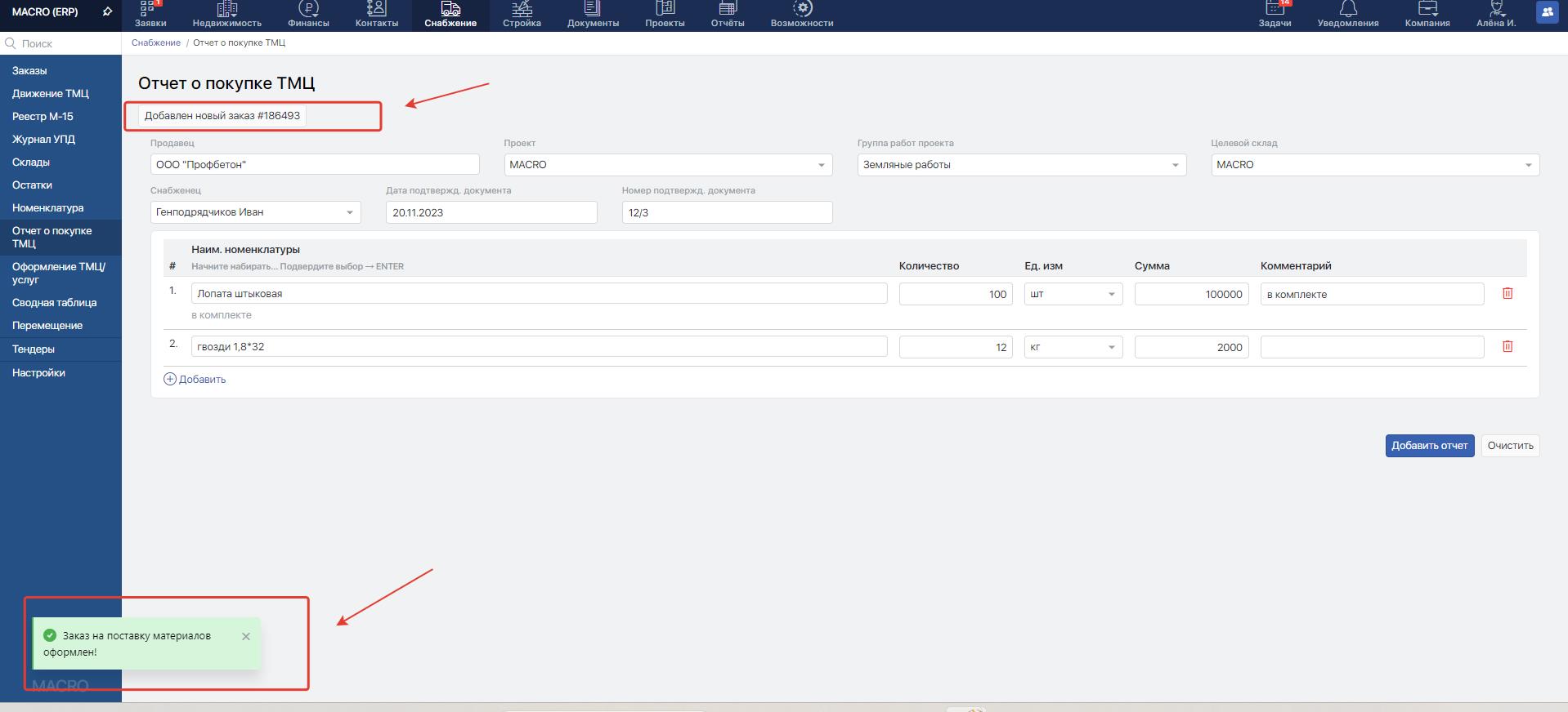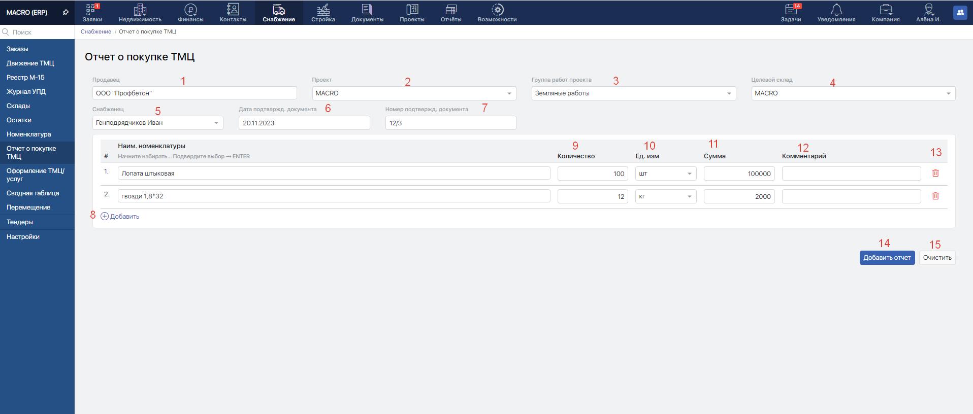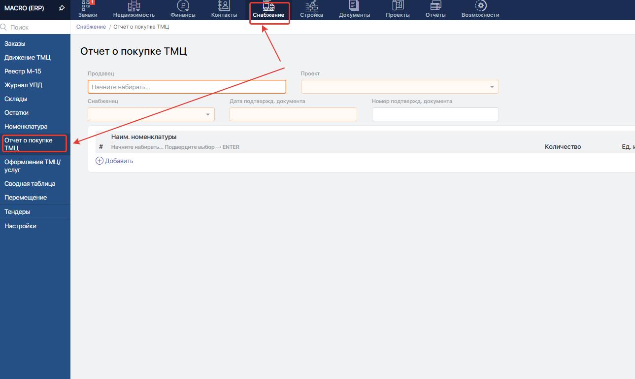 Перейдите в модуль "Снабжение" и в меню слево выберите "Отчет о покупке ТМЦ"
