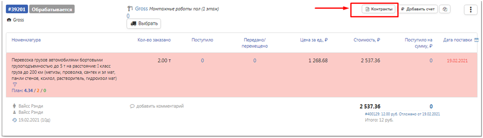 г) указать контракт с исполнителем работ ( при необходимости) контракт должен быть согласован в модуле Контракты и иметь привязку к той же группе работ и проекту, что и в заказе