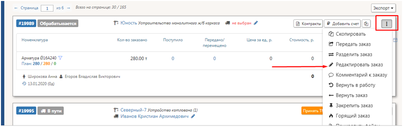 3. Воспользуйтесь инструментом «Редактировать заказ» для оформления стоимости, редактирования наименования как в счете поставщика