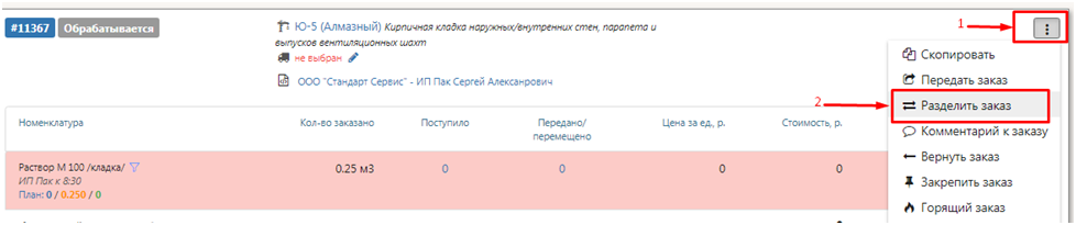 После разделения, заказу присваивается двойной номер, где первый остается неизменным, второй является новым.