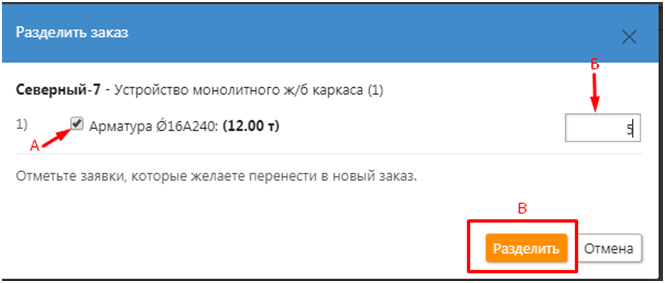 а) зафиксировать галочкой материал, который необходимо разделить из заявки; б) указать нужное кол-во; в) нажать разделить.