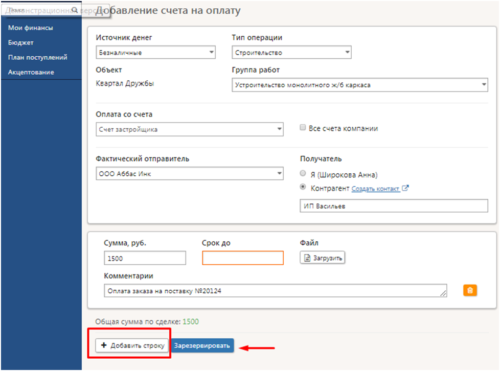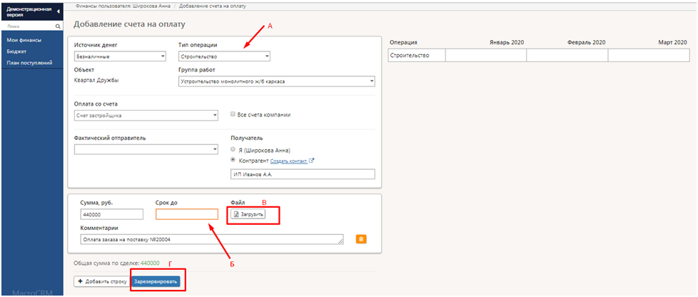а) выбрать тип операции - строительство; б) дату необходимой оплаты по счету; в) загрузить счет; г) нажать кнопку «Зарезервировать»;