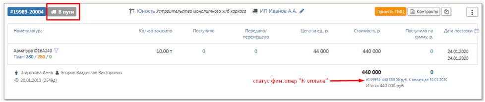 Заказ меняет свой статус - «В пути», фин.операция в статусе «К оплате» уходит на согласование и акцептование.