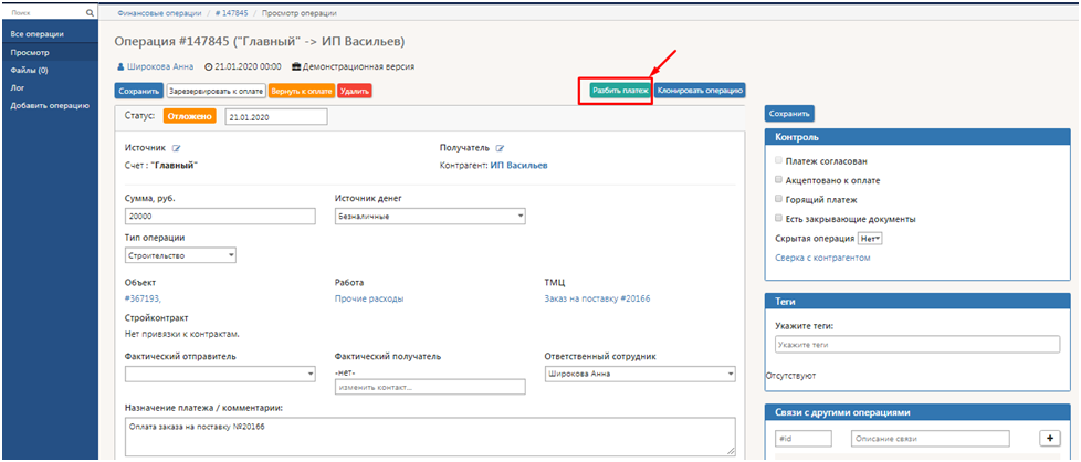 При уже существующей фин.операции а) нажать кнопку «Разбить платеж»