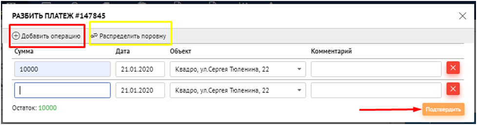-распределить сумму по датам и кол-ву (кнопкой добавление операции- добавлять строки) (кнопкой распределить поровну – разнести сумму на 2 равные части) - нажать кнопку « подтвердить»