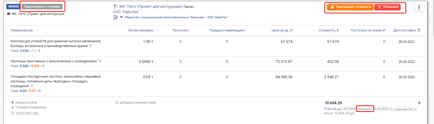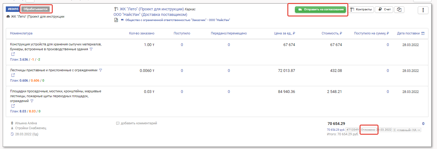 При нажатии кнопки Отклонить заказ возвращается в статус Обрабатывается, и у снабженца снова появляется кнопка Отправить на согласование. Статус финансовой операции остаётся Отложено.