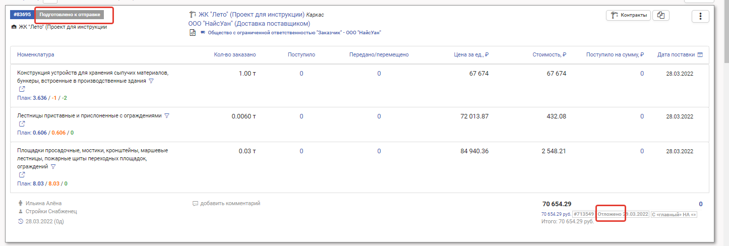 После того как снабженец отправляет заказ на согласование, заказ получает статус Подготовлено к отправке. Финансовая операция остаётся в статусе Отложено.
