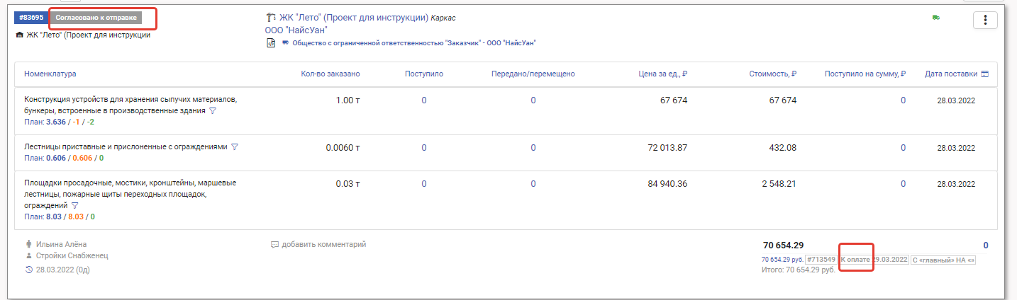 Статус заказа «Согласовано к отправке»