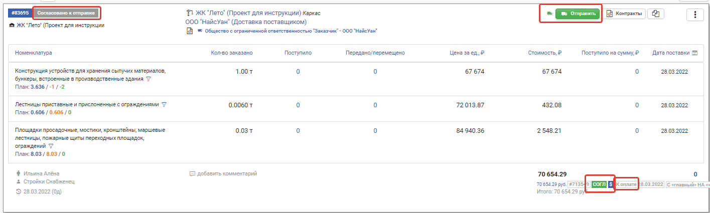Заказ в статусе Согласовано к отправке отображается у снабженца с активной кнопкой Отправить.