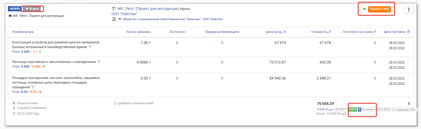 После отправки заказа он получает статус В пути. У сотрудника, выставленного материалистом в настройках проекта, появляется активная кнопка Принять ТМЦ.