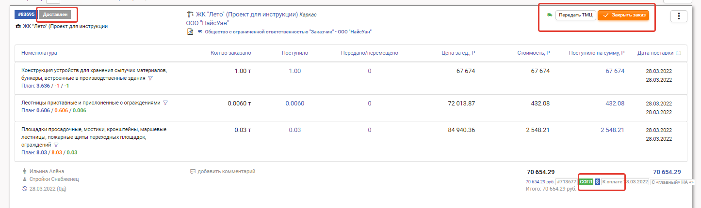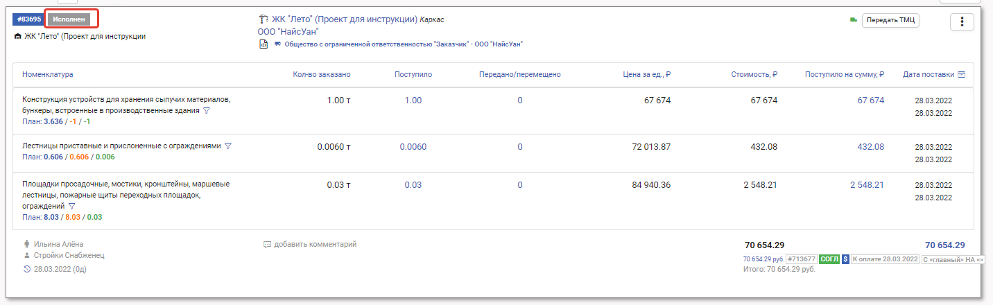 После того как материалист полностью принял заказ, нажав кнопку Принять ТМЦ, заказ получает статус Доставлен.