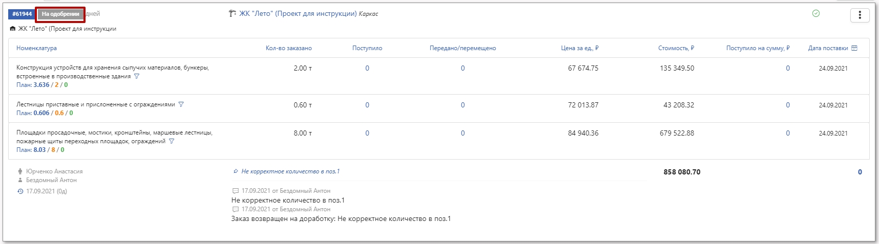 При нажатии кнопки Подтвердить (подтверждение сформированного заказа) заказ получает статус На одобрении.