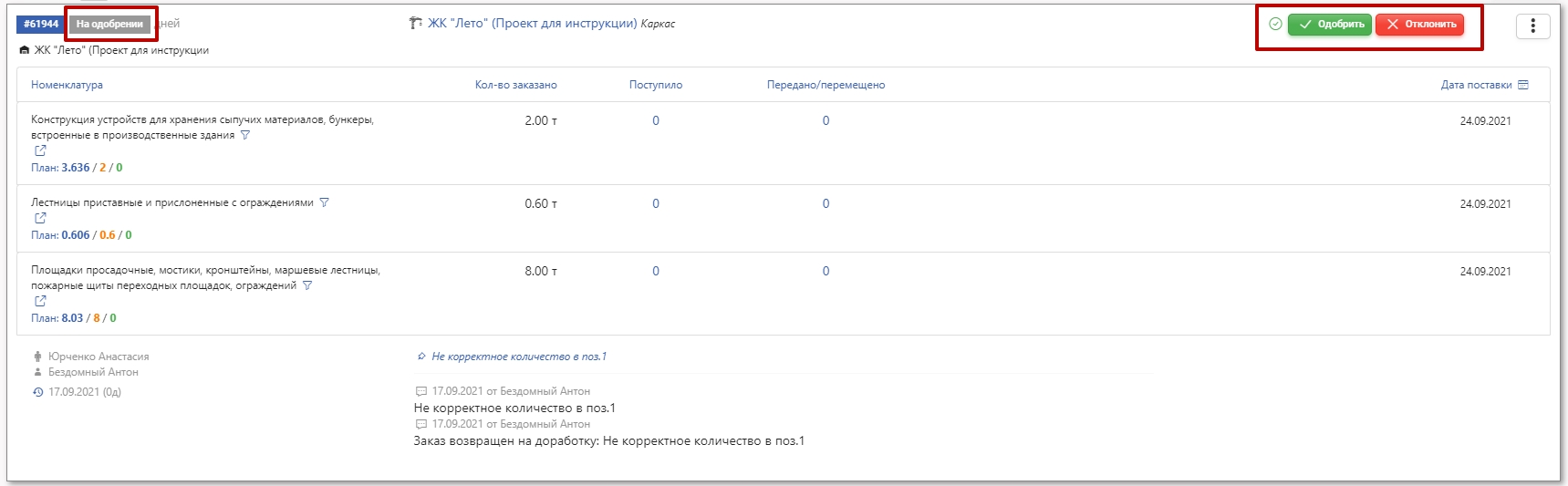 В статусе На одобрение заказ ожидает согласования от ответственного за согласование заказов. В этом статусе появляются кнопки: Одобрить и Отклонить.