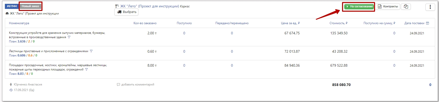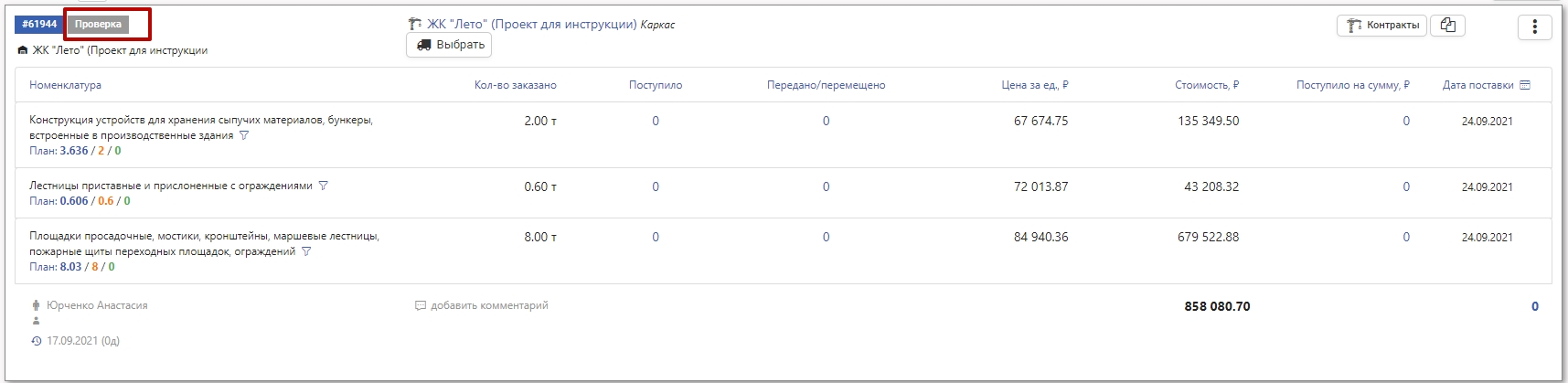 Если в настройках проекта включена настройка «Предварительная проверка заказов ТМЦ», после создания заказа активной становится кнопка На проверку.