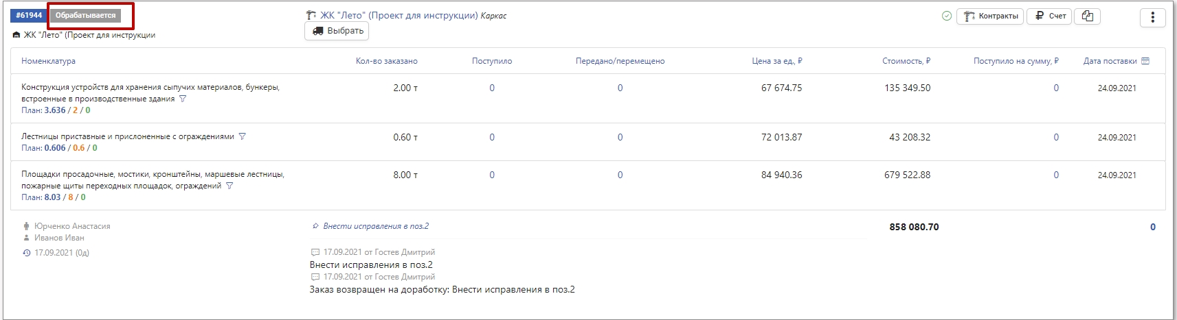 После того как снабженец принял заказ в работу, заказ получает статус Обрабатывается.