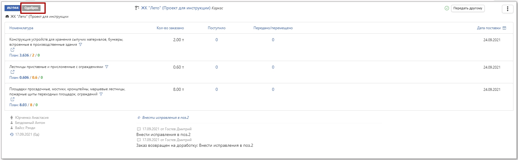 При одобрении заказа он получает статус Одобрен.