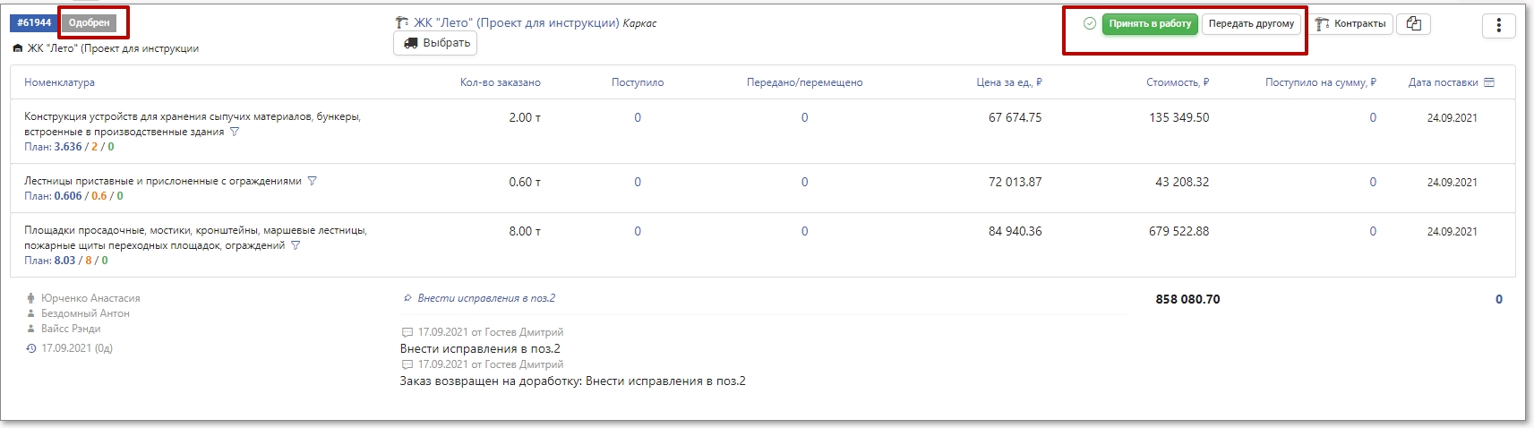 В статусе Одобрен снабженец проекта должен принять заказ в работу.