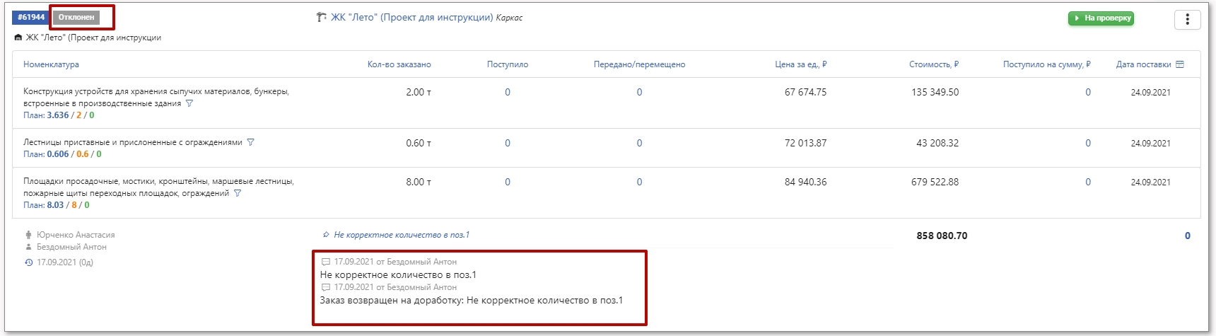 При нажатии кнопки Вернуть заказ получает статус Отклонен. Отклонение заказа требует обязательного указания комментария; все действия и комментарии фиксируются в заказе.
