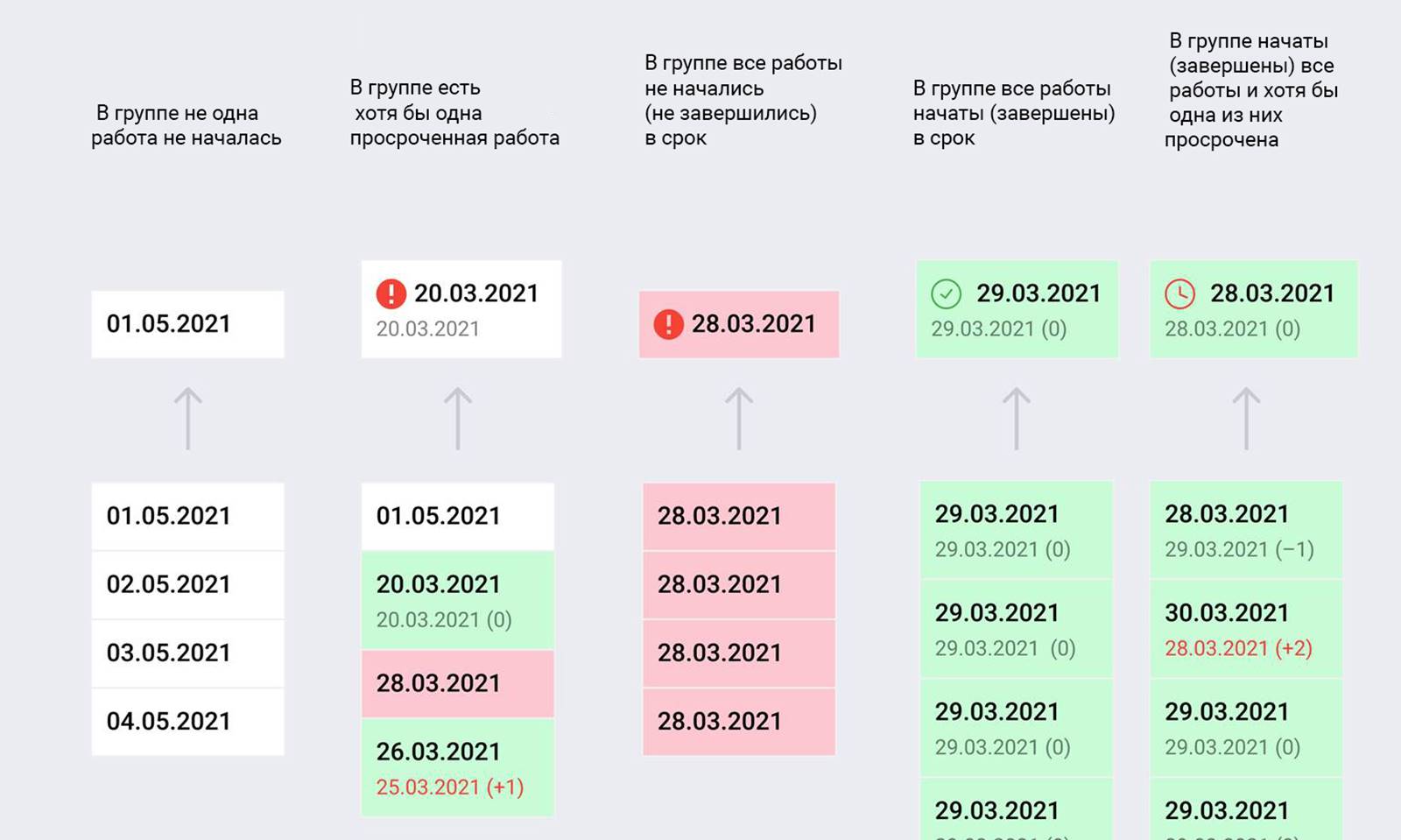 Зеленая галочка - все работы в группе начаты (завершены) в срок.