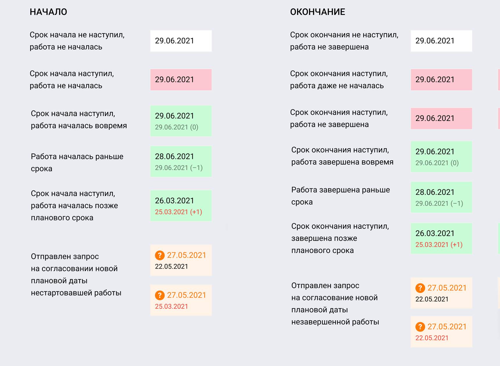Зеленым - для завершенных работ. В верхней строке отображается фактическая дата окончания работ, снизу - плановая, в скобках - отклонение фактической даты от плановой. Если работа была завершена с опозданием - плановая дата выделяется красным цветом; если в срок или с опережением - серым.