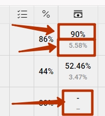 В нижней строке отображается процент выполнения по Ориентиру из раздела Экономика или (если ориентир не задан) по сумме смет по работе или группе работ. Если в нижней строке вместо процентов отображается прочерк — значит, по работе/группе работ либо нет согласованных актов, либо не задан ориентир.