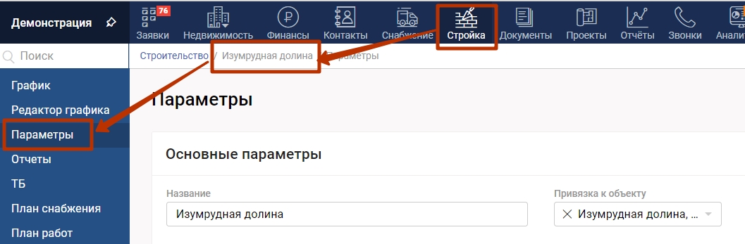 1. В модуле "Стройка" выберите нужный проект и откройте раздел "Параметры"