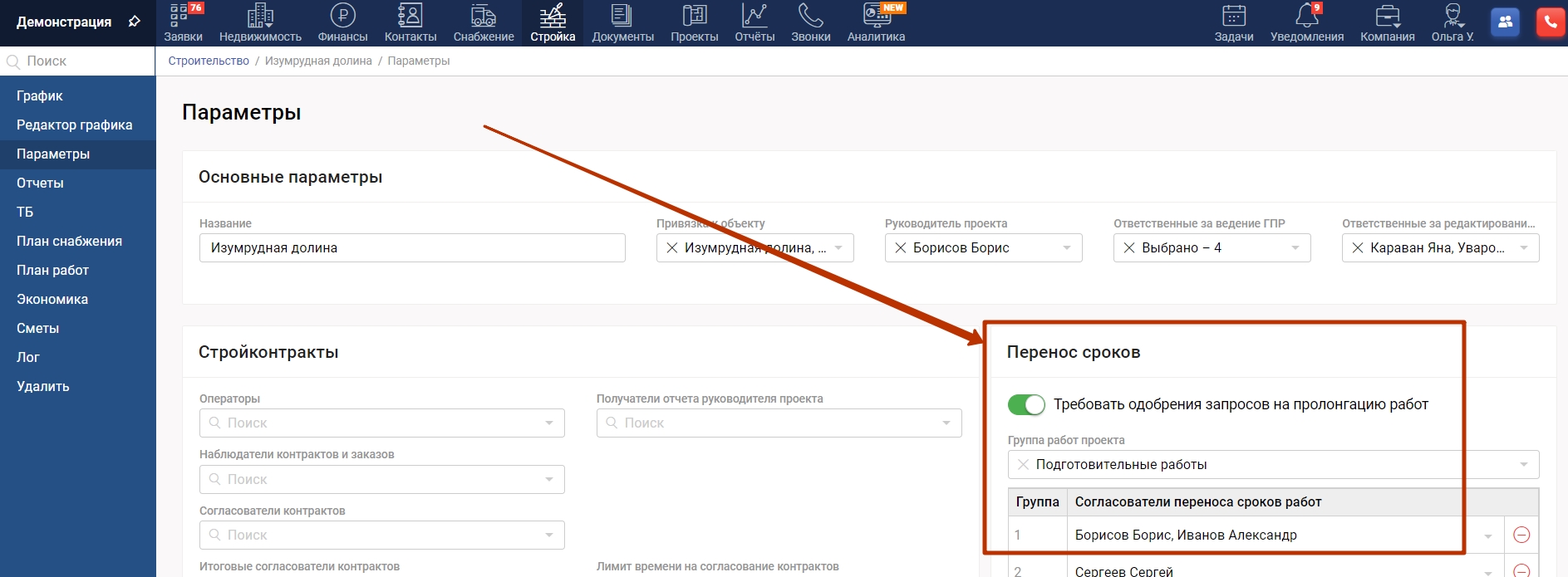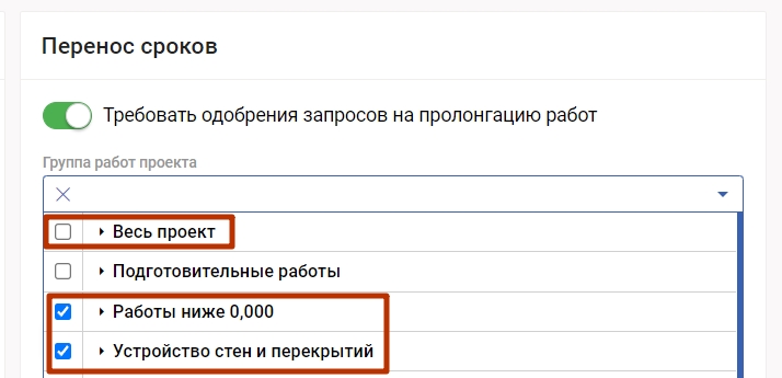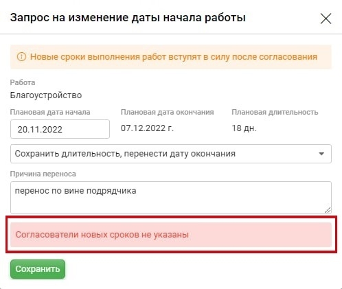Если Вы не укажете согласователей переноса сроков на какие-либо группы работ, то при запросе будет выходить ошибка. Например, на группу "Благоустройство" не указаны согласователи - запрос на перенос сделать невозможно.