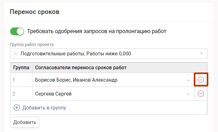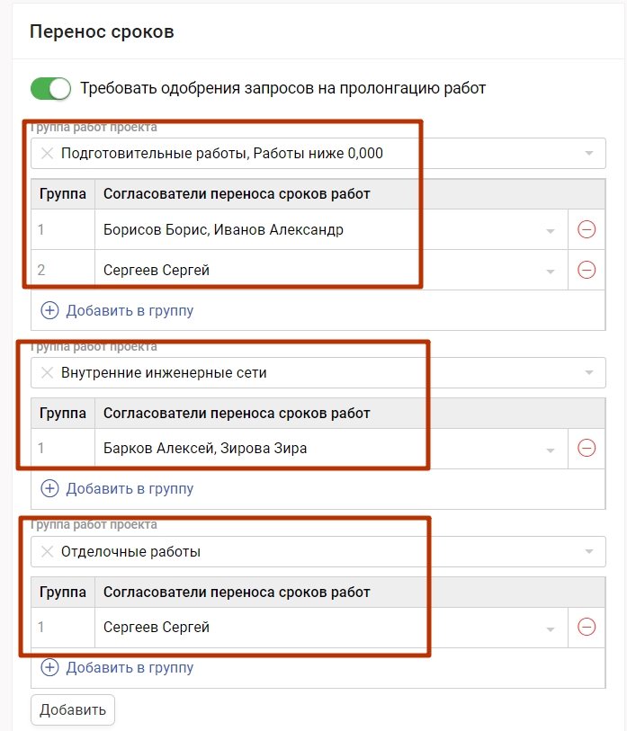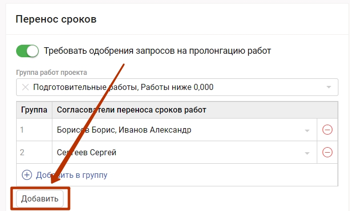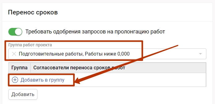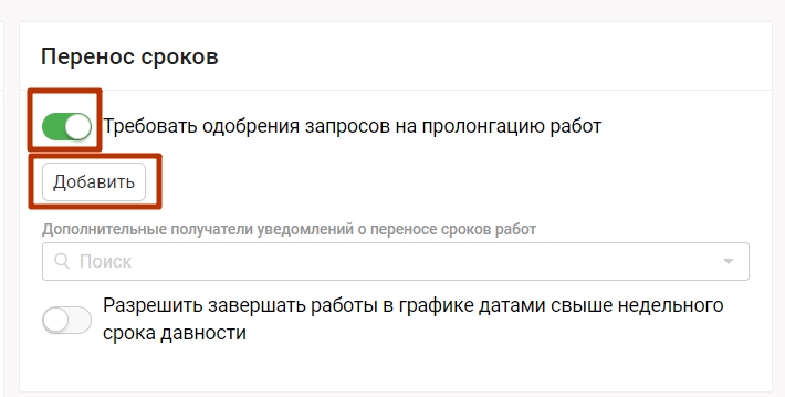 3. Включите тумблер "Требовать одобрения запросов на пролонгацию работ" и нажмите "Добавить"