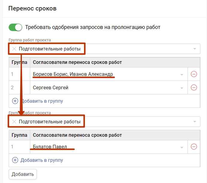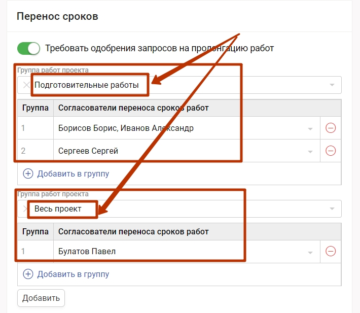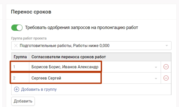 4. Вы можете настроить согласователей по группам, указав нескольких сотрудников в одной группе. Согласователи второй и последующих групп не получат уведомления о необходимости согласовать перенос сроков, пока запрос не одобрят согласователи предыдущей группы.