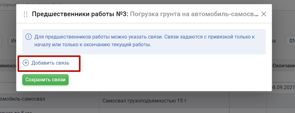 Появится окно. Чтобы добавить связь, нажмите кнопку +Добавить связь. Можно добавлять несколько связей к одной работе — для каждой последующей нажимайте +Добавить связь.
