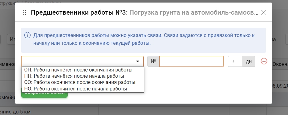 Далее необходимо выбрать предшественника (работу, от которой зависит текущая), при этом при выборе работы в поле отобразится её наименование как подсказка правильности выставления номера. Также для удобного поиска номера нужной работы при прокручивании колёсика мыши прокручивается задний фон (список работ ГПР).