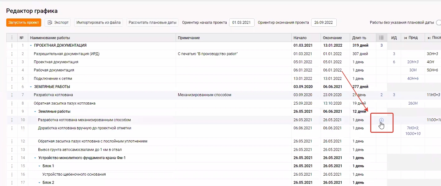 Для этого напротив позиции графика ГПР в, обозначенной на примере колонке, наведите курсор мыши, появится знак плюс, нажмите на него.