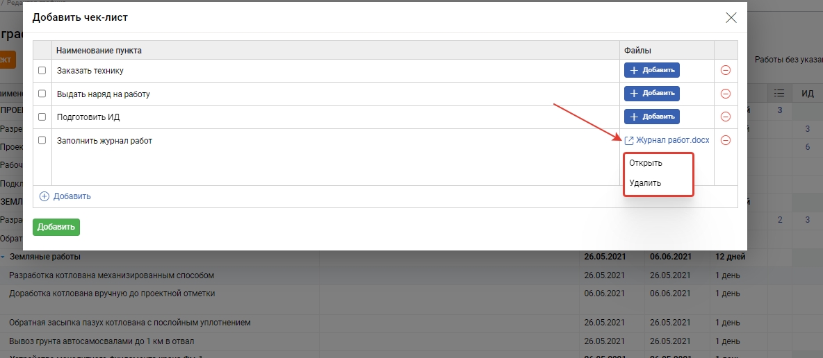 В режиме редактирования графика, к каждой позиции ГПР возможно оформить чек-лист (перечень подзадач для выполнения работы)