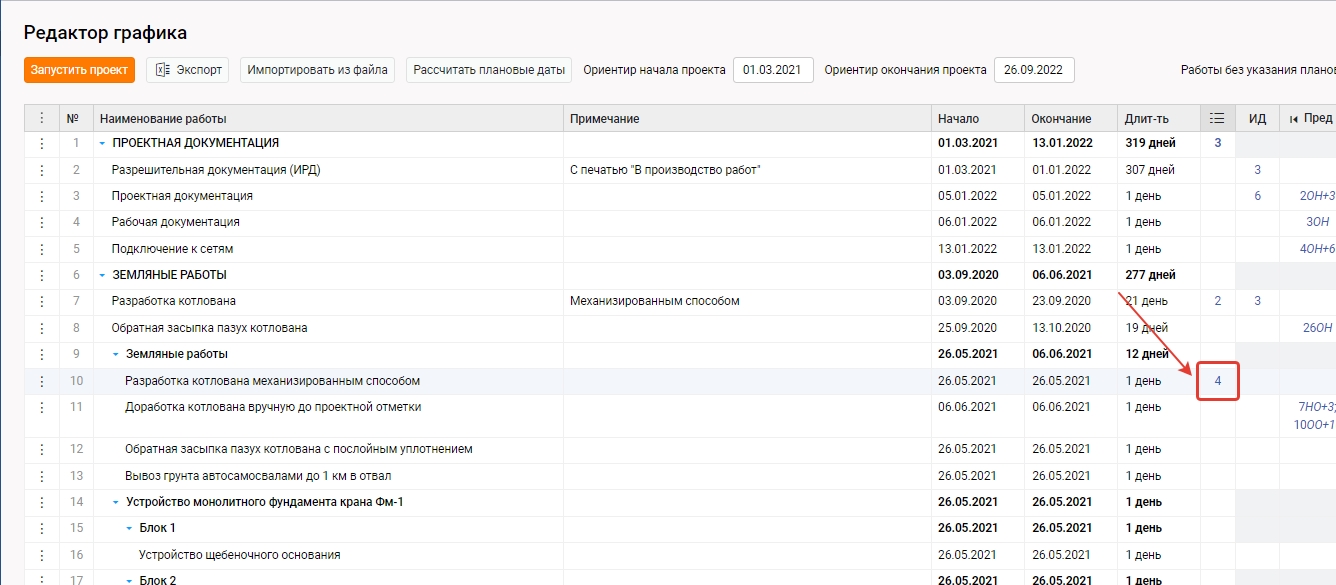 После добавления позиций в режиме редактора графика напротив позиции ГПР, где добавлен чек-лист, появится число, сигнализирующее о том, сколько позиций добавлено в чек-лист.