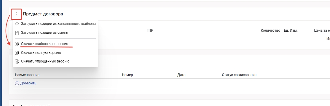 2. В предмете договора нажмите на "Три точки" и выберите "Скачать шаблон заполнения"