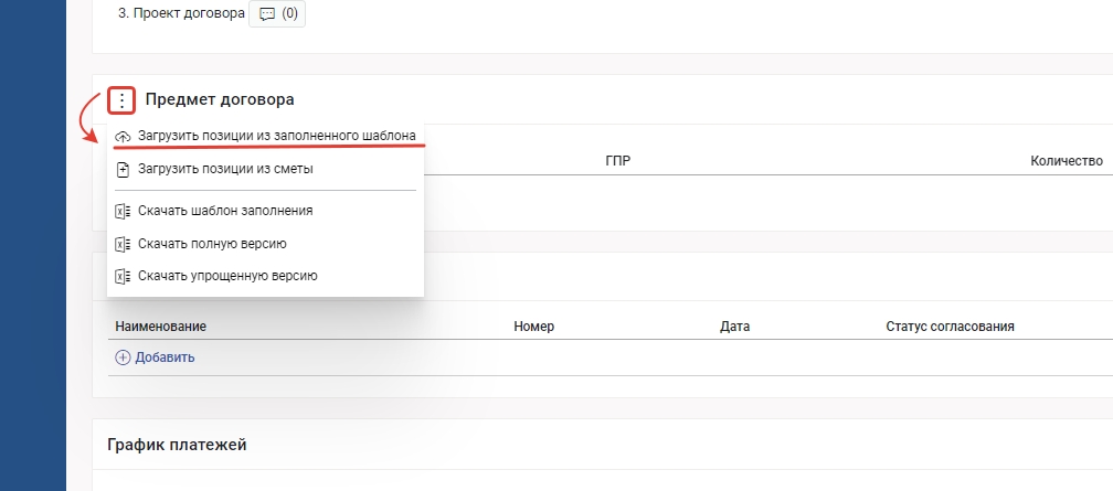 4. В предмете договора нажмите "Три точки" и выберите "Загрузить позиции из заполненного шаблона"