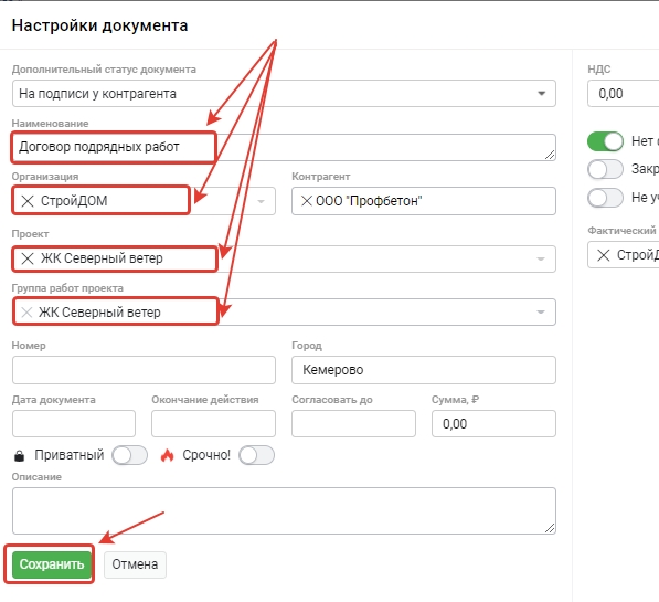 1. Заполните все необходимые поля в параметрах документа и нажмите "Сохранить"