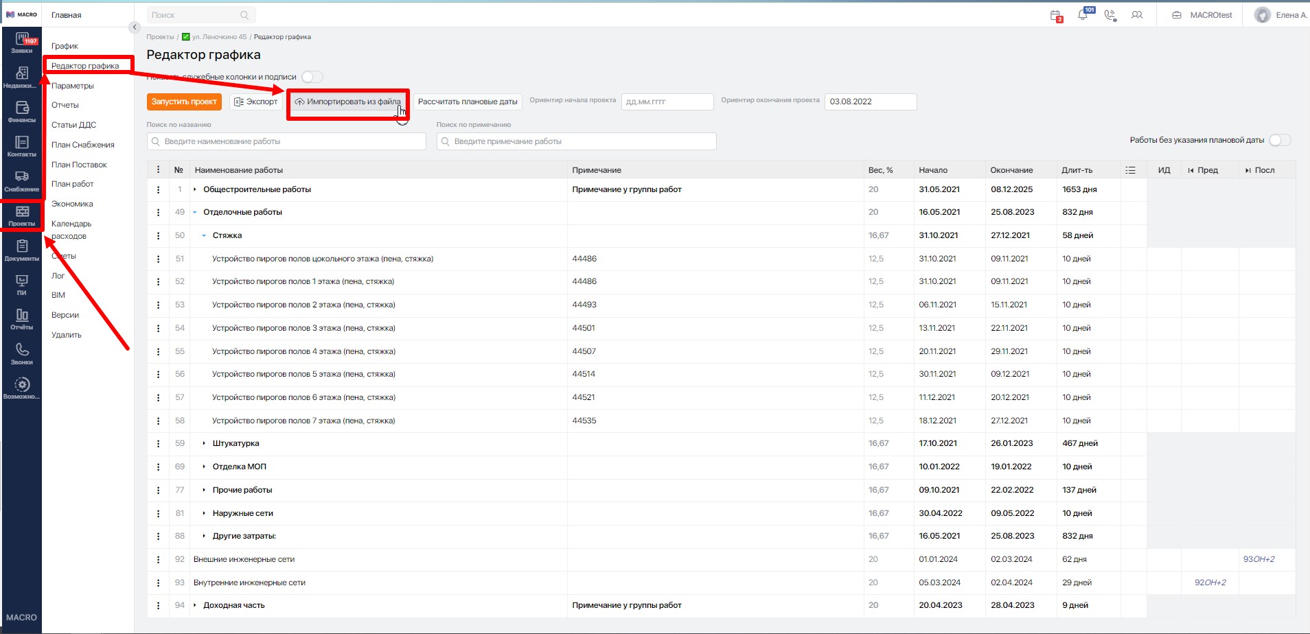Откройте в MacroERP модуль "Проекты", выберите проект, в который нужно внести ГПР, слева раздел "Редактор графика", затем "Импортировать из файла"