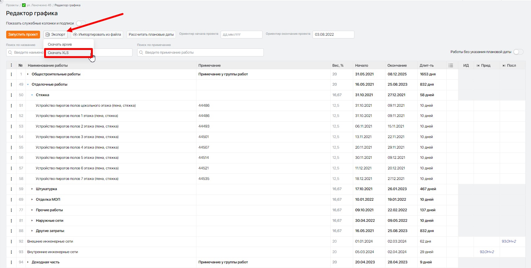 В Редакторе графика нажмите "Экспорт" и выберите "Скачать в XLS"