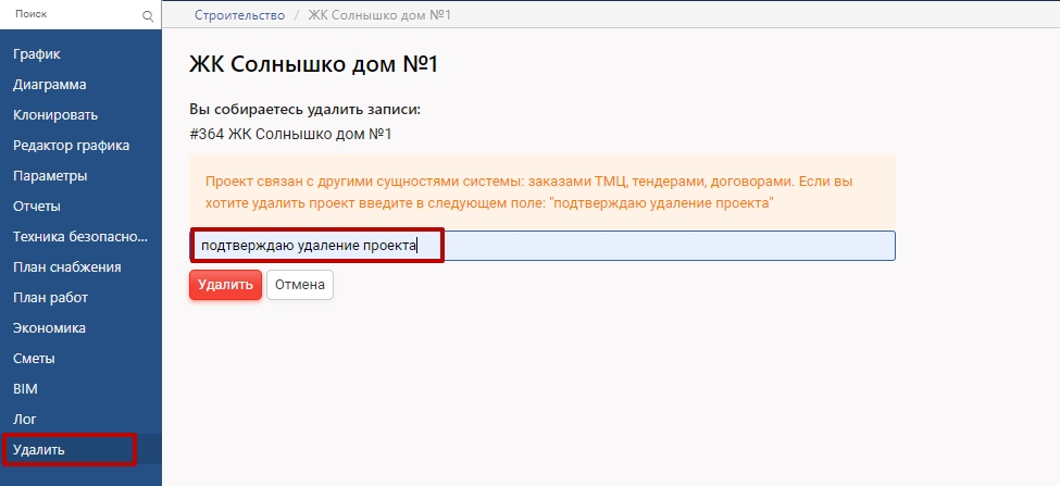Выбрать проект, который следует удалить в листинге проектов, далее в меню слева нажать "Удалить", в открывшемся окне будет предупреждающее сообщение и подсказака, что для удаления проекта необходимо в поле для ввода фразу "подтверждаю удаление проекта", далее нажать "Удалить".