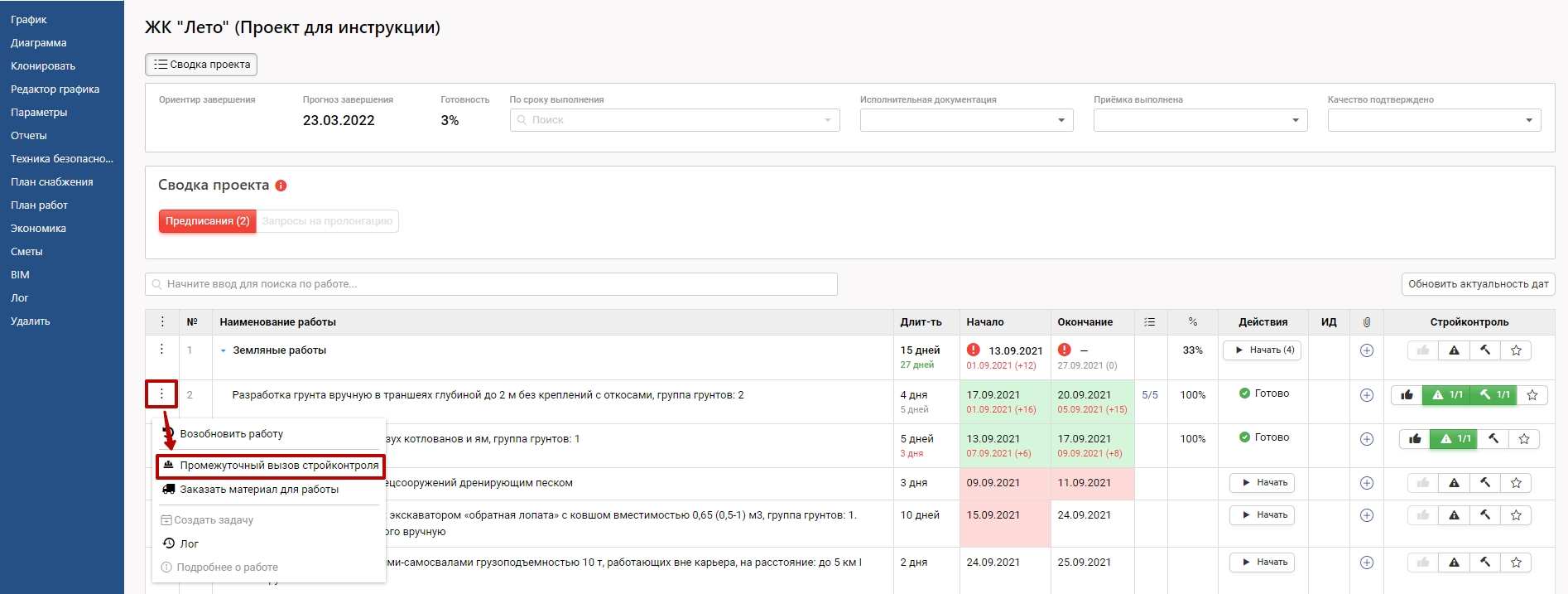 Для этого, необходимо нажать слева от позиции ГПР три точки, в раскрывшемся меню выбрать "Промежуточный вызов стройконтроля"